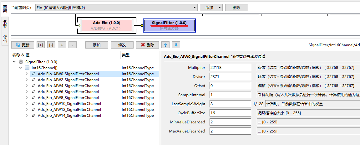 专题介绍:模拟量数据标定基本信息在PLC系统中,采集来的模拟量信号,一般需要通过电路处理才能进入MCU。MCU采集的电压范围必须在0-3.3V以内,这个电压需要通过一定的换算才能计算出PLC实际端口采集的电压或电流。这种换算一般根据电路确定,只要电路是一样的,同一型号的PLC应该采用同样的算法和参数进行标定。在模拟量采集模块Adc_Eio中,可以直接在蓝图中指定线性标定的参数: