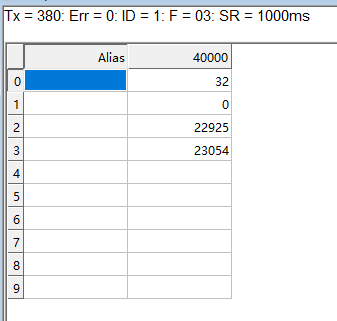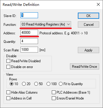 功能码选择03,读取保持寄存器4x区间,通讯地址选择40000:
