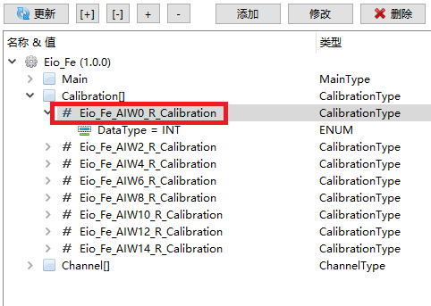 针对以上标定需求,我们在Eio_Fe模块中添加了标定支持。这样不论何种设备采集到的数据,在通过Eio_Fe与PLC的AIW、AQW进行数据交换时,都可以进行修正。 在Designer中的配置实践选择蓝图Eio(扩展输入/输出相关模块),选择Eio_Fe模块,展开需要标定的通道,在Read操作中选择标定数据类型:INT。
