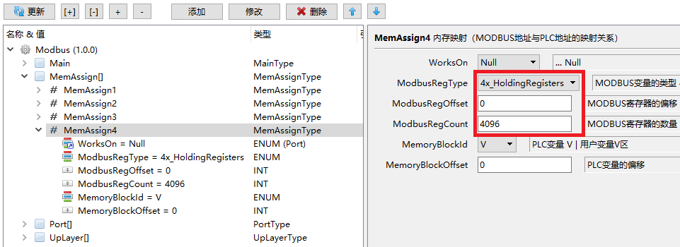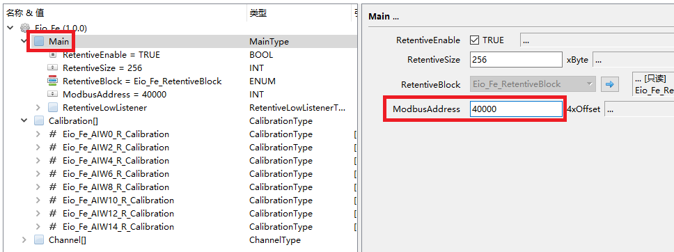 选择Main节点,在修改ModbusAddress的值为40000。