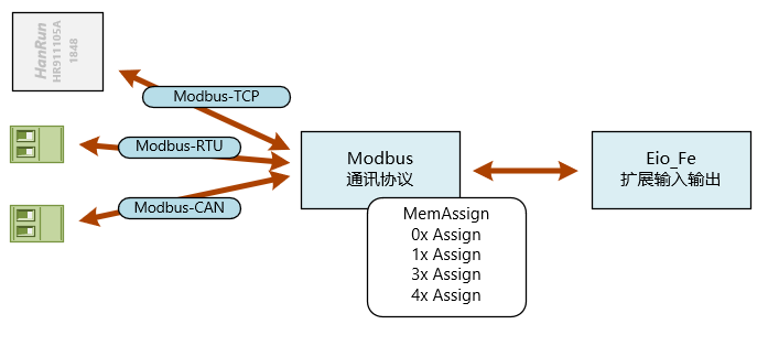 Modbus协议中,有个一个4x区间的映射(保持寄存器),从0地址开始,总计4096个字,远小于这里设定的40000。Modbus协议遇到不能被MemAssign处理的内存映射,则会发起一个信号,询问是否有驱动模块响应这个信号,是否可以处理40000地址的请求。 如果Modbus协议的MemAssign不能处理这个地址,则会将请求转发给Eio_Fe模块: