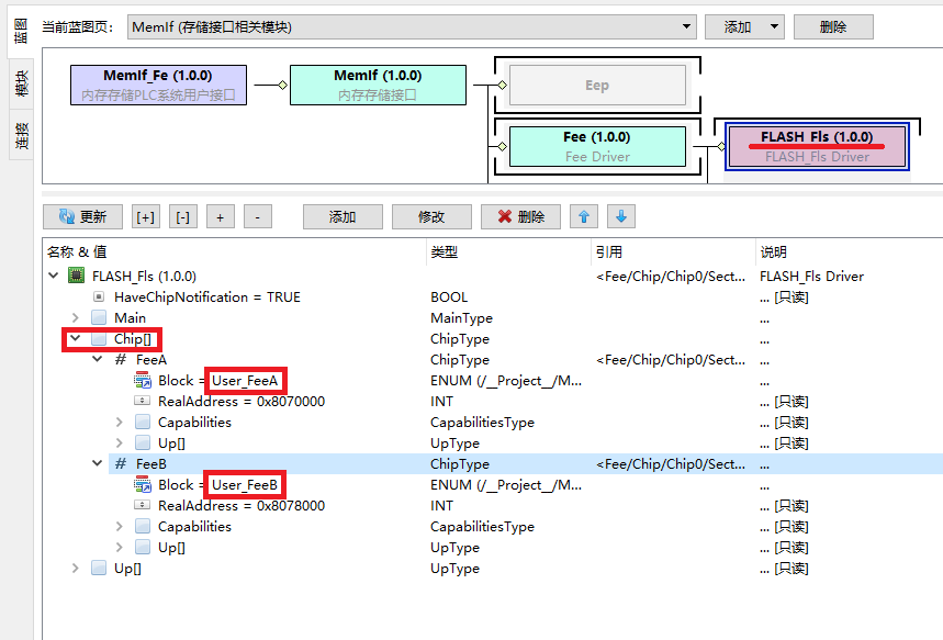 选择FLASH_Fls模块,在Chip下面添加两个芯片FeeA、FeeB,分别绑定Project中分配的FLASH空间User_FeeA、User_FeeB。
