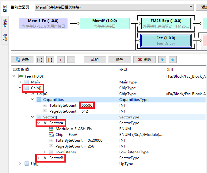 选择Fee模块,在Chip下面添加Chip0。首先,需要指定Chip的可用大小,对于F4来说,扇区是128K大小,为了留有余量,我们指定可用空间为64K。如果是F4,因为扇区是32K大小,我们指定可用空间为16K。然后在Chip0的Sector下面,添加SectorA、SectorB,分别指定FLASH_Fls模块中的芯片FeeA、FeeB: