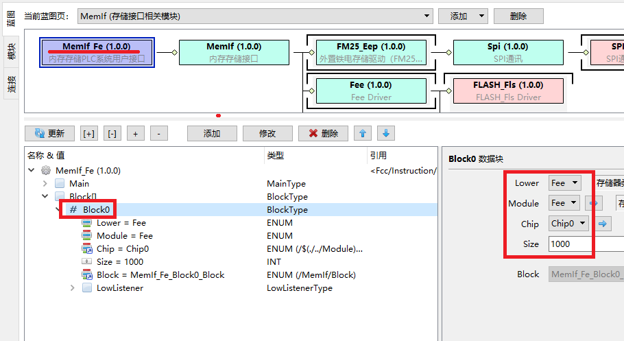 选择MemIf_Fe模块,在Block下面添加一个手动读写块Block0。底层接口Lower选择Fee,模块选择Fee,芯片选择Chip0,大小选择1000个字节: