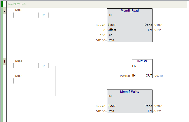 将此项目上传到服务器,并烧录固件到单片机。使用Application Editor上传PLC类型,固件指令中便提供了MemIf的读写指令,使用这些指令做简单的梯形图,便可手动对读写功能进行测试: