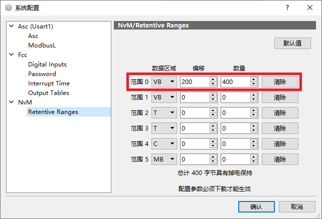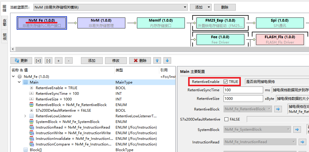 如图梯形图所示,闭合M0.1,则在上升沿将VB100开始的1000个字节保存到内部FLASH。闭合M0.0,则在上升沿将保存的数据恢复到VB100开始的100个字节。 使用NvM实现掉电保持要实现自动掉电保存,首先需要添加NvM蓝图,并在NvM_Fe中添启用掉电保持:
