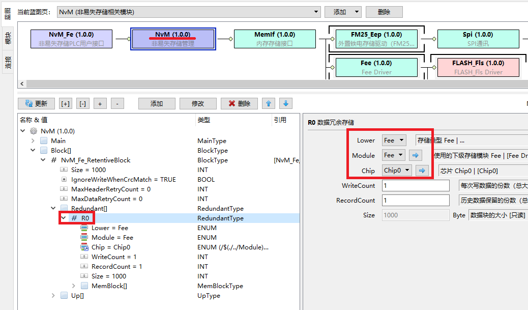 选择NvM模块,在NvM_Fe_RetentiveBlock下面添加数据保存点R0,指定下级接口Lower为Fee,模块为Fee,芯片为Chip0: