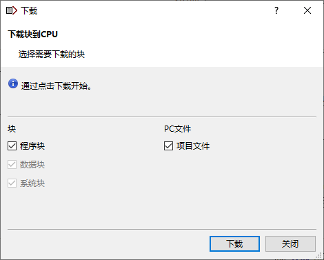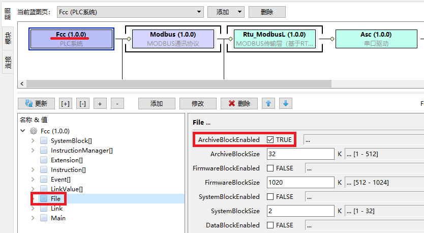 将此系统块下载到PLC,通过通讯的方式修改变量,观察重新上电后,变量值是否保持。 使用Fee保存项目文件切换到PLC系统蓝图,选择Fcc模块,选择File节点,使能ArchiveBlockEnabled: