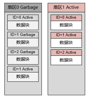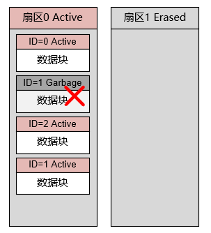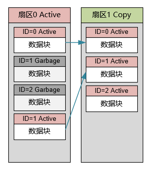 随着旧的数据被标记为Garbage,新的数据在尾部追加,最终扇区0的空间将被消尽。此时如果仍然需要修改数据,则需要将扇区0中的有效数据拷贝到扇区1中去,并在扇区1中添加修改后的数据块: