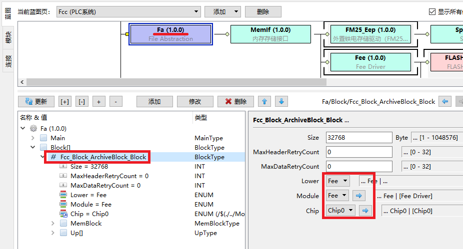 执行编译命令,NvM会在Fa中添加文件Fcc_Block_ArchiveBlock。指定下级接口Lower为Fee,模块为Fee,芯片为Chip0: