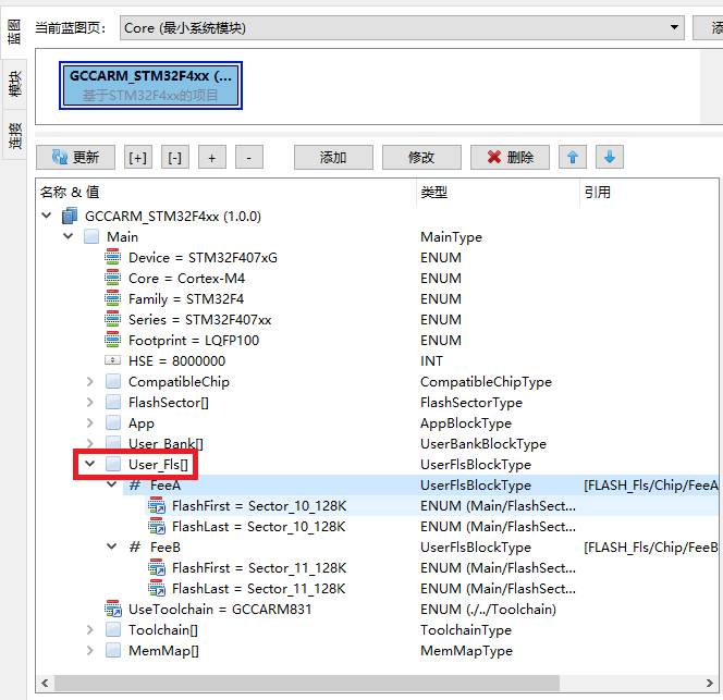 在Designer中的配置实践使用MemIf手动保存数据因为需要使用内部FLASH,首先需要在Project中,分配User_Fls空间,这里以STM32F4举例: