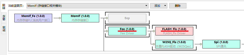 考虑到STM32H7一般为高规格PLC,STM32H7目前并不支持FLASH模拟EEPROM。 然后,需要添加MemIf蓝图,在蓝图中添加Fee和FLASH_Fls模块: