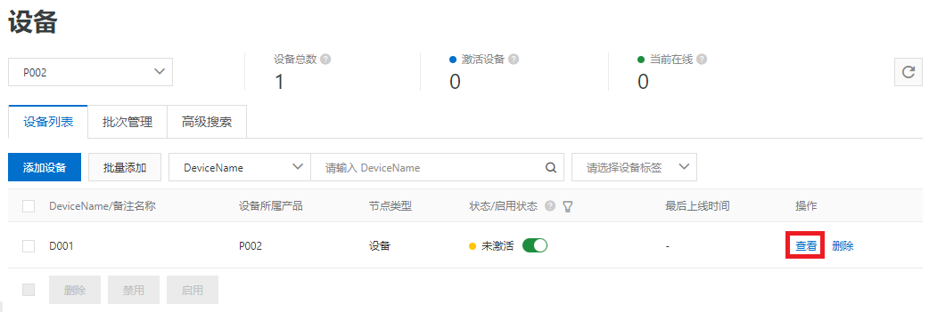 这里我们先尝试通过Mqtt_Connect连接阿里云,编写以下程序。注意指令里面用到的参数全部使用网站出的MQTT登录信息。将此程序下载到开发板,打开程序监控: 可以看到Status最后变成4,查阅指令说明可知,已经正确登录到阿里云MQTT服务器: 登录阿里云控制台,找到产品P002的设备列表,也可以看到设备D001被自动激活且在线: 向阿里云发布消息