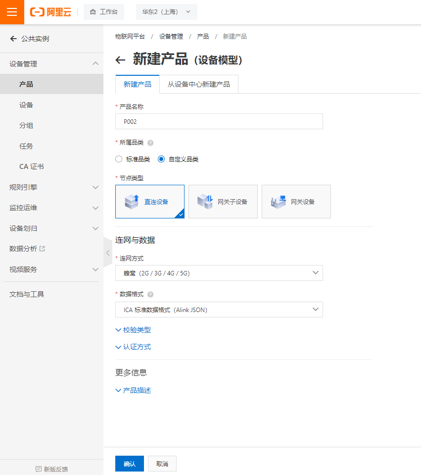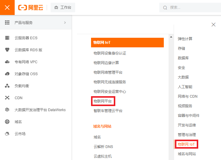配置好串口后,下一步我们添加EC600网卡。选择“TCP/IP通讯”选项卡,点击“添加”按钮下面的“添加EC600”命令: 选择网卡EC600A,在硬件选项卡中,选择串口为USART6,PEN管脚为PB2,PWK管脚为PA15: 选择网卡EC600A,在MQTT选项卡中,勾选“此硬件端口可以支持MQTT协议”: 点击确定即可生成蓝图。蓝图上传到服务器;完成开发板的烧录;PLC类型部署到本地后,便完成了硬件部署。 阿里云设备创建登录阿里云通过网址https://www.aliyun.com/可以登录到阿里云。在已经注册了阿里云账号的情况下,进入控制台: 在控制台产品与服务中,选择“物联网IoT”分类下的“物联网平台”: 作为测试,可以使用公共实例,如果没有开通,需要先开通公共实例: 点击公共实例,可以查看此实例下的产品,这里我们添加一个新的产品: