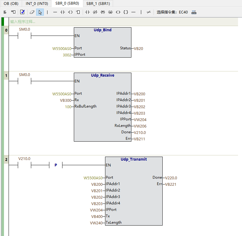 通过观察自动生成的代码可以发现,对于运算类型的代码,例如LD指令,直接带参数调用Fcc_EC40_LD函数即可。对于PLC系统指令,例如Udp_Bind指令,并不是简单的运算,必须由PLC系统来完成,则通过Fcc_ExcuteInstruction函数来实现,不同的PLC系统指令通过指令号来区分。如果是调用PLC系统指令,需要通过一个全局变量Fcc_param来进行参数的交换。 Fcc_param的定义在【Fcc_Priv.h】文件中实现: 这里我们新建一个NativeC的SBR1,将SBR0的自动生成的C代码部分拷贝到SBR1中去,让SBR1完成SBR0同样的功能。我们在SBR1的代码上稍作修改,完成一个简单的变量应答功能,当以太网的UDP的端口收到变量字符串时,通过字符串形式发送变量的值: 将此程序下载到开发板DK60-STM32F412RE,在状态表中设置VW10的值: 打开TCP&UDP测试工具,通过UDP连接到开发板的3002端口,发送字符串【VW10】,则可以看到开发板返回的值【4455】 |