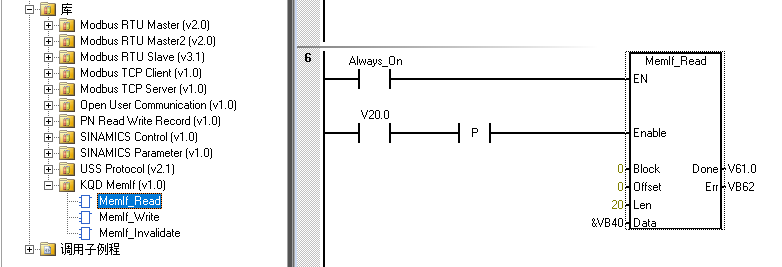 可以在KQD的主循环中进行子程序调用测试,将VW20设置为100、VW22设置为20,观察VW24是否为2000: