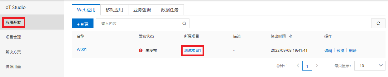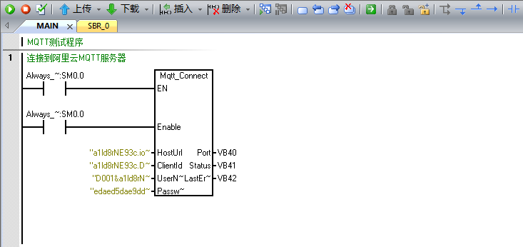 属性上报的数据格式为JSON格式,例如: 为了方便生成JSON格式的数据,KQD驱动平台提供了JSON数据读写指令,可参考:特殊指令:JSON数据操作 添加如下梯形图,网络2通过对SM0.5上升沿的计数,每2秒接通V52.0一个扫描周期。网络3按照阿里云JSON格式的要求,构造需要发送的JSON数据: 网络4将构造的JSON数据发送到设备属性上报主题上去: 将此程序下载,在状态表中输入VW100,设置值为1200: 登录阿里云控制台,找到产品P002的设备D001,在设备“物模型数据”选项卡下面,“运行状态”子选项卡中,可以查看到开发板上报的数据: 订阅阿里云的主题并接收消息网络5使用订阅指令,订阅MQTT服务器的设备属性设置主题。网络6如果主题收到了消息,用JSON指令将JSON数据中的电机运行频率提取到PLC变量VW102: 登录阿里云控制台,在导航“运维监控”下找到“在线调试”,选择产品“P002”的设备“D001”,属性调试选项卡下面设置电机频率为30Hz,最后下拉菜单中点击设置: 在状态表中输入VW102,可以看到其值已经被修改为30: 开发板中模拟出口压力与电机频率的关系因为没有实际的变频器和压力传感器,这里我们简单模拟下出口压力与电机频率,假设出口压力正比于电机频率,网络7完成了这个简单的计算: 阿里云可视化开发(IoT Studio)点此连接可以进入IoT Studio的管理界面:https://studio.iot.aliyun.com/ IoT Studio的管理界面,导航栏选择“项目管理”,普通项目下面点击“新建项目”,选择项目名称“测试项目1”: IoT Studio的管理界面,导航栏选择“应用开发”,在“Web应用”选项卡下面点击“新建”: 应用名称修改为W001,点击“确定”按钮: 因为需要绑定产品,先返回“应用开发”,在“Web应用”选项卡下面点击刚才新建的项目“测试项目1”: 在“测试项目1”的项目详情中,导航处点击“产品”,点击“关联物联网平台产品”: 勾选开始创建的产品“P002”,勾选“关联产品同时关联其下所有设备”,点击“确定”: 回到“测试项目1”的项目详情,点击Web应用W001的“编辑”按钮: 点击导航处的“组件”按钮,选择“基础组件”,拖动一个“仪表盘”,一个“滑条”到页面中去。 选中仪表盘,点击右侧样式中的“配置数据源”,在浮动窗口中数据源选择“设备”,产品选择“P002”,设备选择“D001”,数据项选择“设备属性”,属性选择“出口压力”,最后点击“确定” 选中滑条,点击右侧交互,新增“交互1”,事件设置为“值改变”,新增“动作1”,动作设置为“设置设备属性”,产品选择“P002”,设备选择“D001”,属性选择“电机频率”: 开发板LCD组态打开KQD Application Editor,选择开始创建的PLC类型后,新建项目,在“系统扩展”下面新建“TinyLcd”: 在LCD的首页,创建两个变量,一个变量绑定VW100表示出口压力,一个变量绑定VW102表示电机频率: 将此程序下载到开发板,即完成了开发板LCD组态。 通讯验证回到“测试项目1”的项目详情,点击Web应用W001的“预览”按钮: Web页面加载成功后,在页面拖动滑块,可以看到压力相应的变化: 相关文件