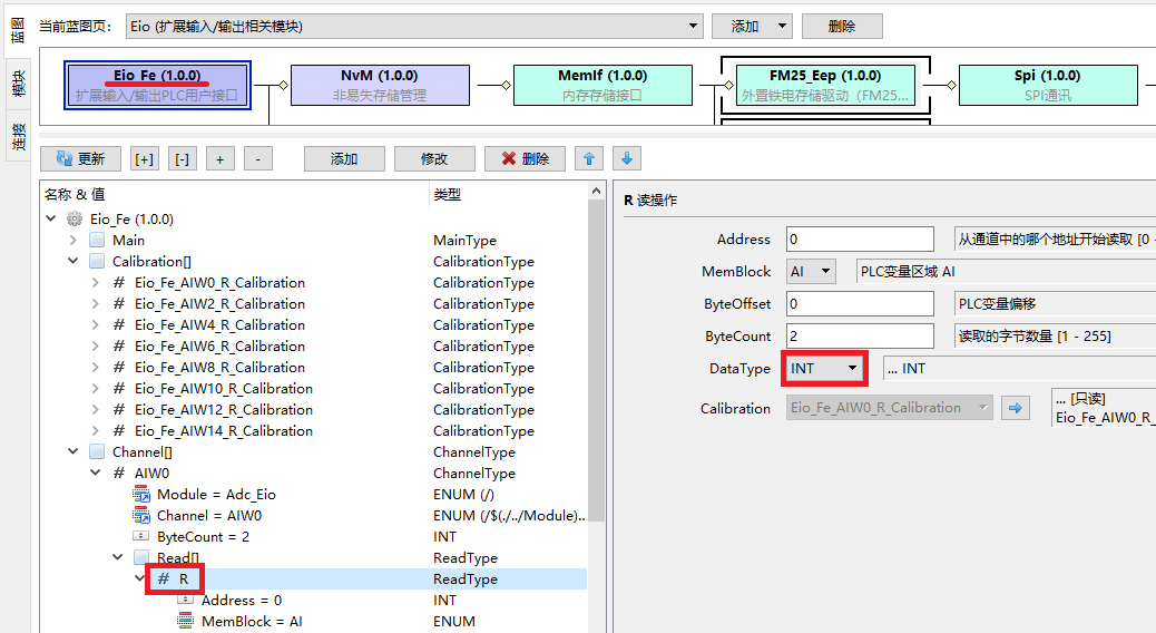 针对以上标定需求,我们在Eio_Fe模块中添加了标定支持。这样不论何种设备采集到的数据,在通过Eio_Fe与PLC的AIW、AQW进行数据交换时,都可以进行修正。 在Designer中的配置实践选择蓝图Eio(扩展输入/输出相关模块),选择Eio_Fe模块,展开需要标定的通道,在Read操作中选择标定数据类型:INT。