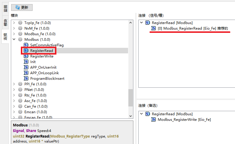可以在模块连接中是否建立Modbus到Eio_Fe的信号与槽的绑定: