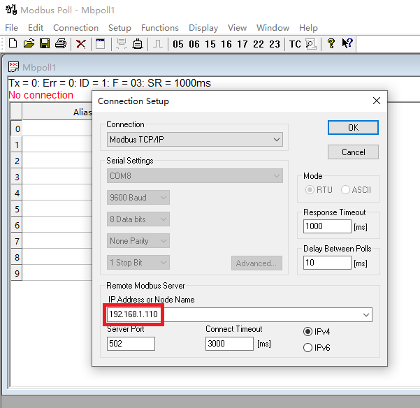 打开软件Modbus Poll,这里我们使用以太网连接到PLC: