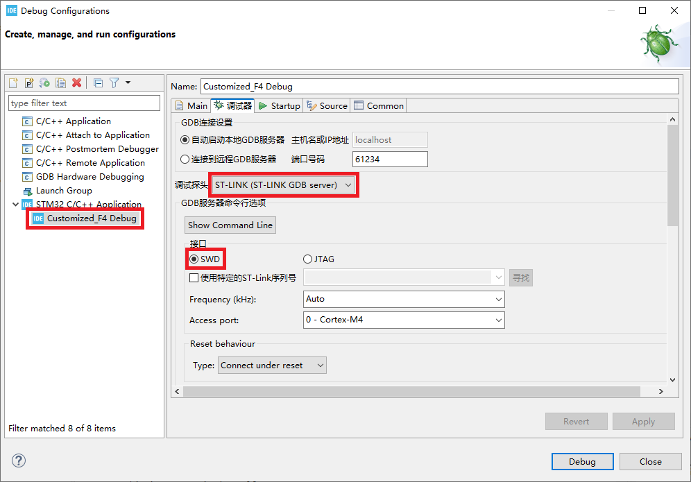 - 如果在Designer的配置中,SWD调试管脚(例如STM32F407的PA13、PA14)未分配功能,则可以使用调试器(例如ST-LINK)对定制开发项目进行调试。其开发过程与正常的单片机开发并无根本的区别。