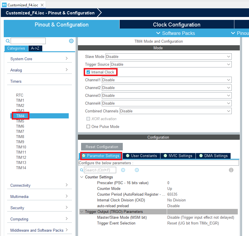 在硬件配置中,选择“TIM4”,勾选时钟为“Internal Clock”。“Parameter Settings”采用默认配置即可。
