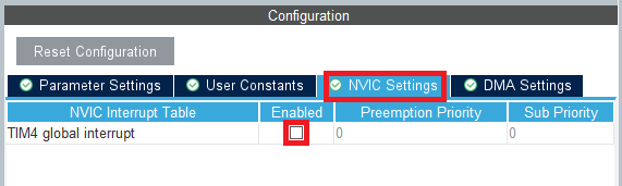 因为中断由PLC系统统一管理,中断优先级的设置和中断的开启关闭应该使用PLC系统提供的接口。因此这里需要选择“NVIC Settings”,确认下TIM4的全局中断没有被勾选。