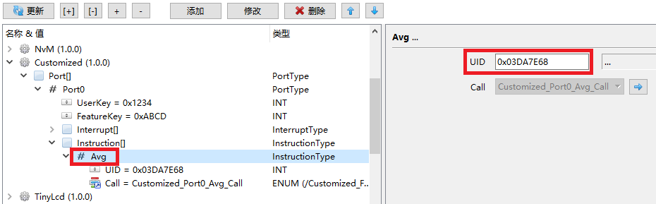 有的时候,用户希望通过梯形图指令来调用定制开发算法,或者是通过指令来控制特殊硬件。快驱动PLC系统预留了定制开发指令的接口。在下面的例子中,我们在定制条简单的算法指令。指令根据给定的PLC变量偏移和变量数量,计算这些变量的平均值并将结果返回梯形图。在设计器Designer中,点击蓝图页的空白处,配置中找到“Customized”,展开“Port[]”后,在“Port0”的“Instruction[]”下面添加节点“Avg”。点击此节点,UID输入一个随机的32位整数,并点击“应用修改”按钮将值写入配置。