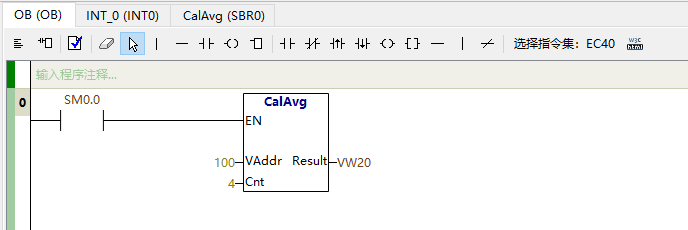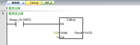 在主程序中调用CalAvg子程序时,将地址偏移100写入LW0、变量数量4写入LW2。子程序调用SET_ADDR指令进行Customized_Call的内部指令调用。这个指令会查询定制开发项目是否有匹配的指令实现,最后会调用定制开发的指令实现。在定制开发项目的Instruction_Avg_ByEcc回调函数中,会在LW0中取地址偏移100,在LW2中取变量数量4,计算好平均值后,结果写回LW4。CalAvg子程序在返回时,将LW4作为计算结果写入VW20。将此程序下载到开发板,在状态监控表中修改VW100为100、VW102为100、VW104为100、VW106为0;便可以在VW20中得到这4个数的平均值75: