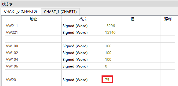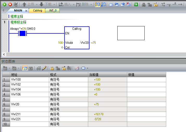 在主程序中调用CalAvg子程序时,将地址偏移100写入LW0、变量数量4写入LW2。子程序调用Customized_Call指令。这个指令会查询定制开发项目是否有匹配的指令实现,最后会调用定制开发的指令实现。在定制开发项目的Instruction_Avg回调函数中,会在LW0中取地址偏移100,在LW2中取变量数量4,计算好平均值后,结果写回LW4。CalAvg子程序在返回时,将LW4作为计算结果写入VW20。将此程序下载到开发板,在状态监控表中修改VW100为100、VW102为100、VW104为100、VW106为0;便可以在VW20中得到这4个数的平均值75: