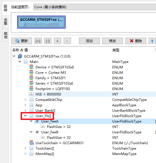 在Designer中的配置实践使用MemIf手动保存数据因为需要使用内部FLASH,首先需要在Project中,分配User_Fls空间,这里以STM32F4举例: